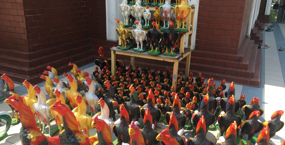 From there we slowly and carefully descended the possible stairs of death. To my relief no such death or accident happened, and we found our hosts. We wandered around this area for a little bit and ended up finding a more recent temple and an area completely full of chickens. I kid you not, there were chickens/roosters everywhere! They were bedazzled, painted brightly, taller than me, and as you may have guessed, statues. It was incredible and definitely reminded me of the Oviedo chickens! Back in home in the small downtown area of Oviedo, Florida, there are wild chickens that run about the town and intersection. Ironically they live next to Popeye's (which serves chicken), and they are not only a sign of Oviedo, but it is against the law to hurt them. One could almost call them sacred, or if nothing else, iconic. I have added some pictures from there as well.